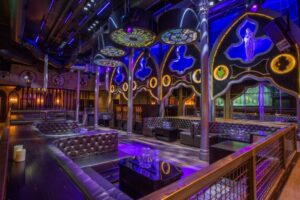 - Features: 11 private booths with storage & charging stations, Funktion One sound system, LED lighting, 2 full bars, and custom projection displays